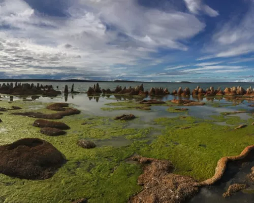 Este full day en Tierra del Fuego comienza y termina en Punta Arenas. Una vez llegado a Bahía Chilota comenzamos nuestra excursión la cual nos llevará en un viaje en el tiempo (3.800 millones de años atrás), a los comienzos más primitivos de la vida en la Tierra. Laguna de los Cisnes–Monumento natural la cual alberga vida bacteriana que crean exóticas estructuras conocidos como Estromatolitos. A continuación visitaremos el mirador Hain de Porvenir, capital de la isla grande de Tierra del Fuego donde es posible observar la ciudad y su bahía desde la altura. También se exhiben en este mirador dos esculturas que representan un ancestral ritual de iniciación Selknam-Hain. Desde Porvenir continuamos nuestro viaje bordeando la costa de Tierra del Fuego (Bahía Inútil). Durante toda la excursión es posible disfrutar de la vida salvaje y especialmente del ícono de esta gran Isla–Guanaco. Alcanzaremos estancia Onaisín, una antigua estancia de pioneros fueguinos donde donde visitaremos el cementerio británico, para luego trasladarnos muy cerca de este último hasta la Reserva Natural Pingüino Rey donde pasaremos poco más de una hora observando y admirando la belleza de esta Ave sub Antártica. Después de este maravilloso momento regresamos a la ciudad de Porvenir para tomar ferry de regreso hacia la ciudad de Punta Arenas y desde terminal tres puentes en vehículo hasta los respectivos lugares de estadía de nuestros turistas.